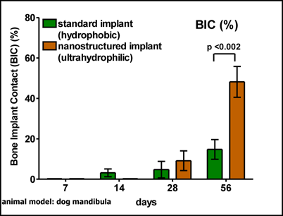 Ultrahydrophilic nanostructured implants (Morphoplant’s technology) show significant increase of bone implant contact (BIC) compared to hydrophobic standard implant (commercially available)